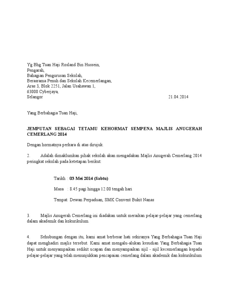 Surat jemputan sebagai perasmi. Surat jemputan ke majlis anugerah cemerlang 1. Surat rasmi kebenaran ibu bapa surat rasmi b.